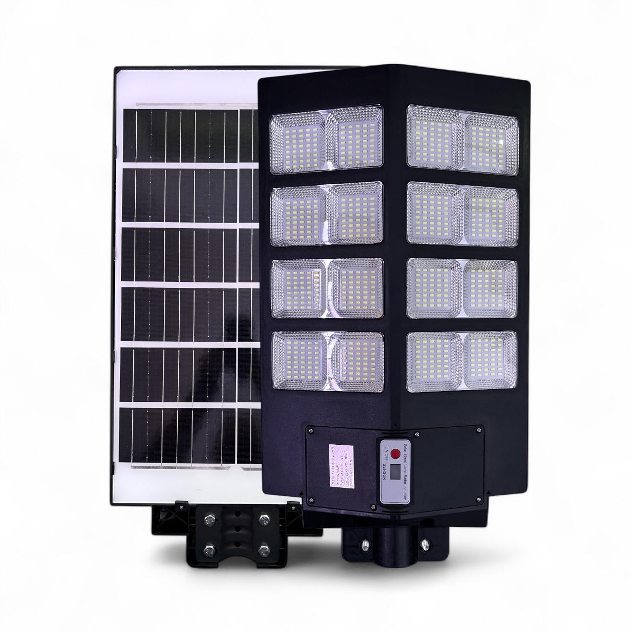 Luminária Holofote Solar 800W (Equivalência Lâmpada Incandescente) com controle remoto para funcionalidades padrões. Acionamento por detector de movimento!